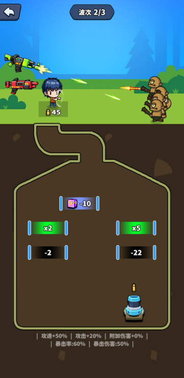 此游戏为休闲战斗类游戏,游戏中你需要防守我方阵地,可以通过移动下方炮台来改变子弹方向,以便更好的获取奖励,当击破宝箱则会出现各种奖励供你选择,可以让你更加轻松的击杀敌人,还有商店和任务系统,各种道具等你来拿。