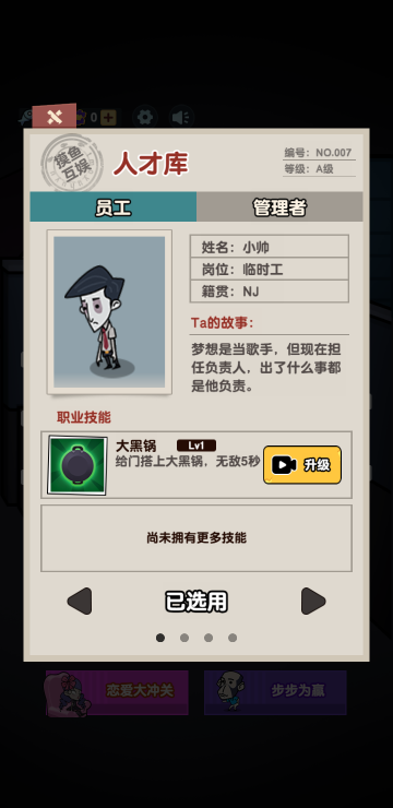 此游戏为休闲类游戏,游戏内你可以尽情摸鱼。每局对战结束可以获取摸鱼币,用于兑换皮肤和道具,在摸鱼中使自己变强大,成为最终的胜利者,还有多个小游戏可以选择,让你的摸鱼快乐加倍!