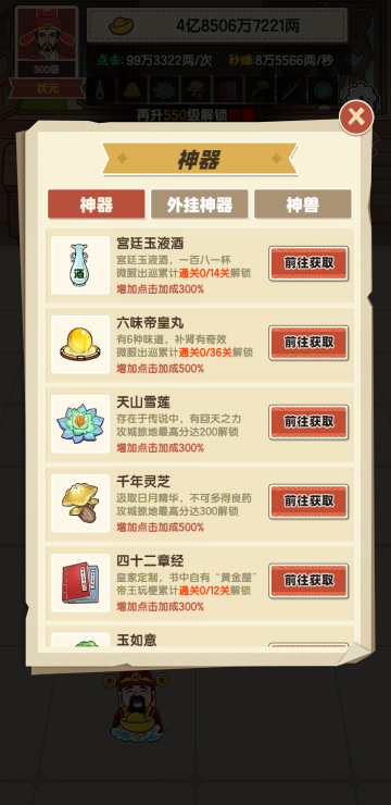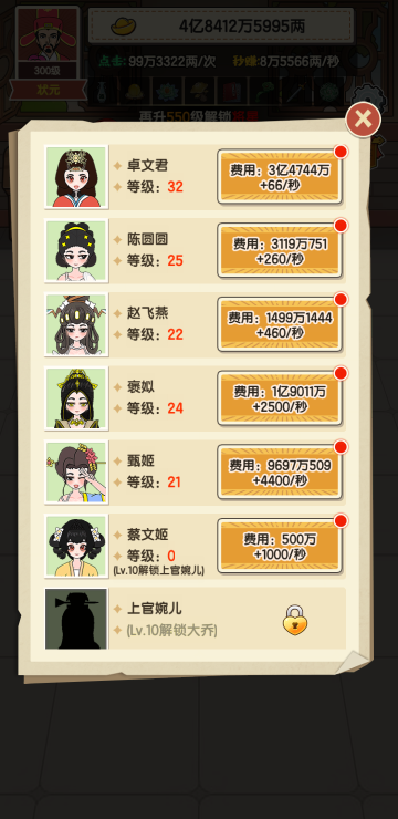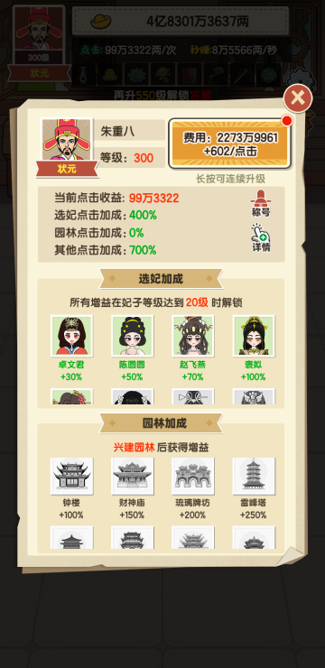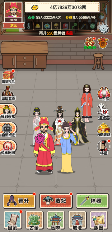 此游戏为休闲养成类游戏,开局的你是乞丐模样,通过不断赚钱升级成为皇帝不是梦,游戏内赚钱的方法很多,可以通过选妃属性加成收益,通过升级解锁技能置办产业和征收他国供奉,还可以通过各种小游戏来获取高额收益,快来体验吧。