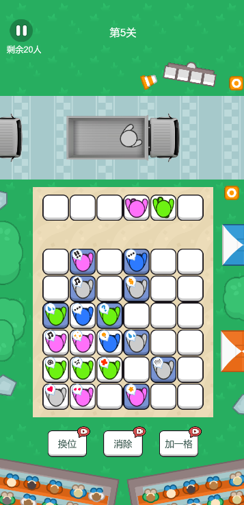 此游戏为休闲类游戏,游戏玩法很简单,只需要根据提供的车辆颜色来选择对应的顾客安排他们上车,可以使用空白空格来填放多余的顾客,关卡越高难度越高,合理使用道具才是通关的关键。