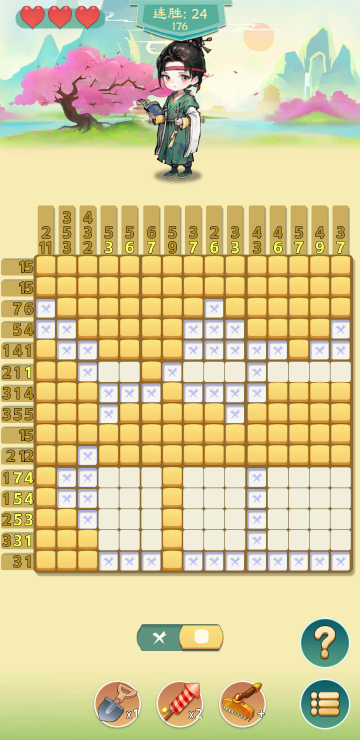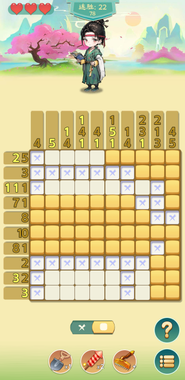 此游戏为休闲益智类游戏,难度逐渐提升,有5X5、10X10、15X15,玩法与九宫格数独也不一样,你需要根据横竖的数字来判断每个格子的状态,不会的可以根据新手引导提示来逐渐熟悉,由易到难后面就会更加轻松,也能体验到不同的数字乐趣。