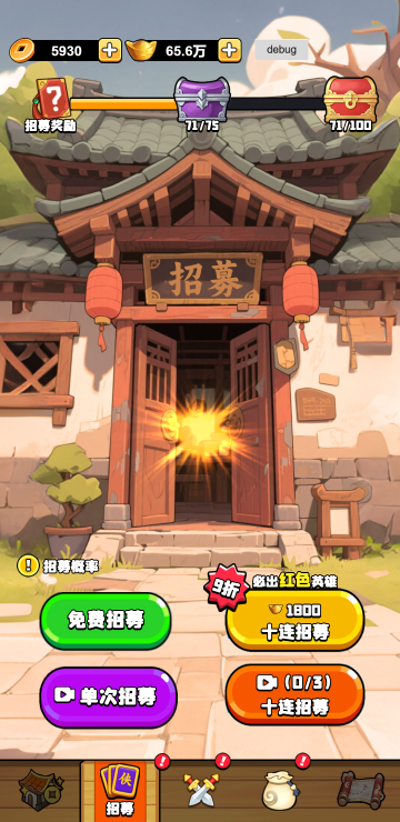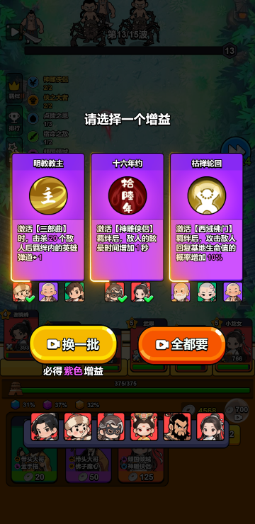 此游戏为休闲塔防类游戏,游戏中你可以招募获取侠客,并且通过升级提升他们的实力,战斗中可以通过消灭敌人获取铜币来刷新侠客和解锁战斗位,选择合适的侠客加入战斗,注意有羁绊加成的侠客会大幅度增加属性值,还可以通过选择不同的属性加成来提升团队实力。