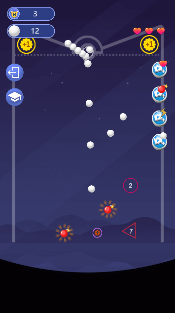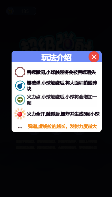 用小球不断击打逐渐上升的方块,不能让方块到达顶端否则游戏失败,合理使用道具让游戏体验更佳。