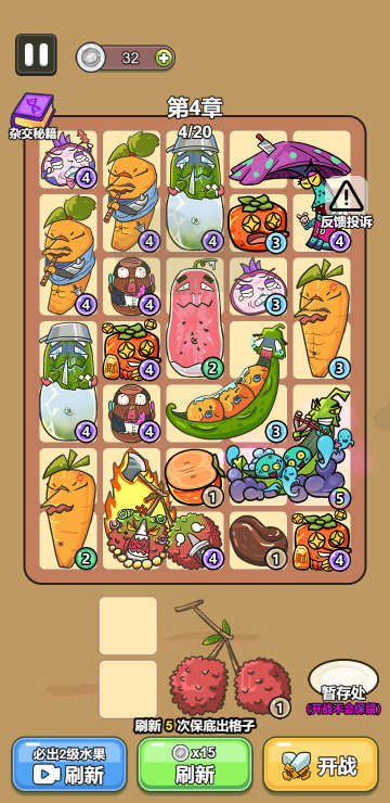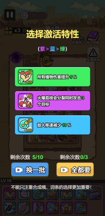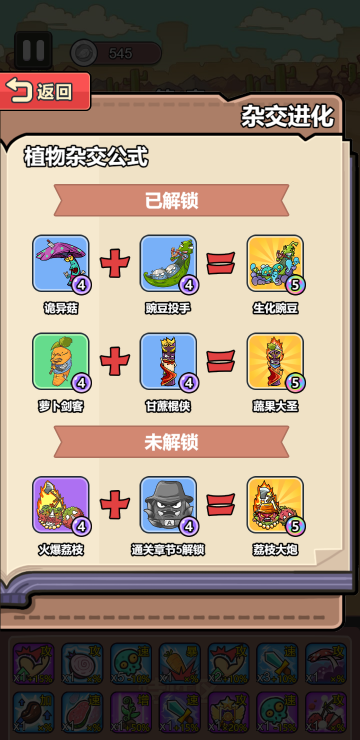 此游戏为休闲塔防类游戏,游戏中你需要通过消灭怪物获取到的金币,来不断刷新植物并合成更高级的植物,可以通过杂交公式的指引合成顶级特殊植物,威力大大提升。选择合适的词条来强化植物也是很有必要的,游戏外你也可以升级植物等级来提升它们的实力,这样游戏会更加轻松,过关更加容易。