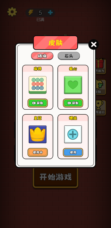此游戏为休闲消除类游戏,游戏分为5种游戏模式,也对应5种场景,每种游戏模式都值得体验,如果不习惯系统初始给的皮肤还可以通过观看视频来改变成想要的皮肤,带上你的勇气快来密室闯关吧。