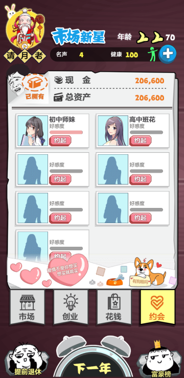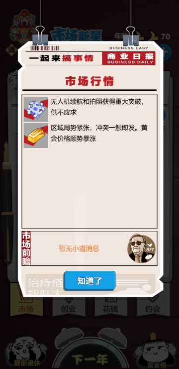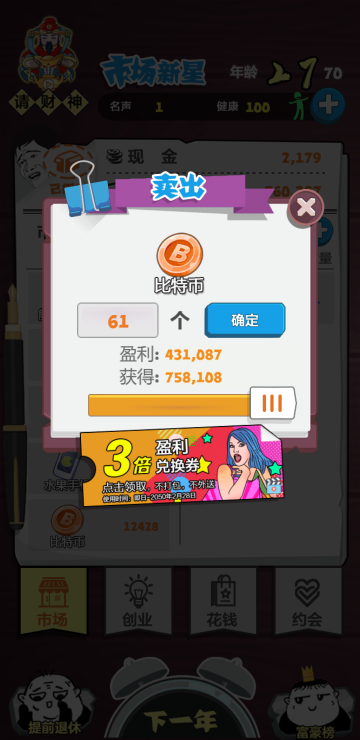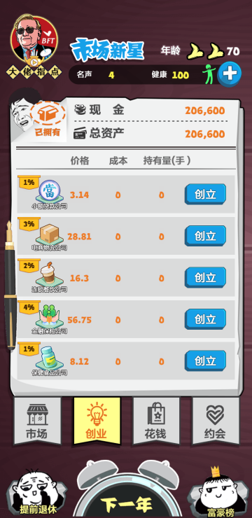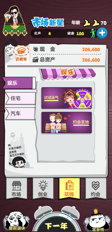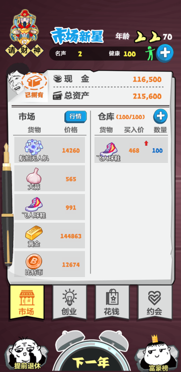 这是一个赚钱的游戏,通过行情来分析下一年什么会涨什么会跌,以便更好囤货,还可以开公司,买豪车,约会美女等等,你想要的这里都有。