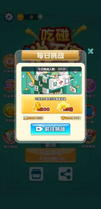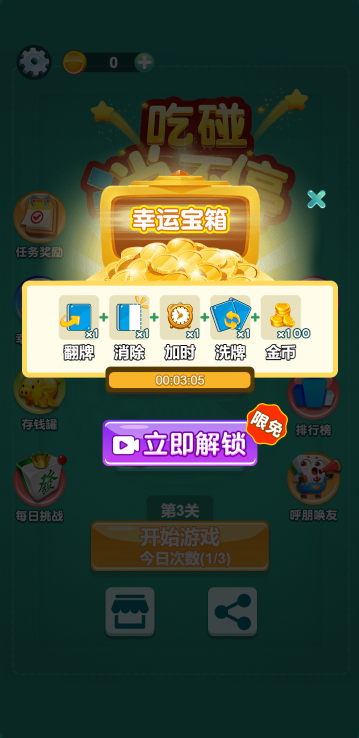 此游戏为休闲消除类游戏,游戏以消除为基础。玩家需通过组合相同图案的方块进行消除,首次将麻将玩法与消除结合,增强趣味性。提供超多关卡,难度逐级递增,确保长期可玩性。