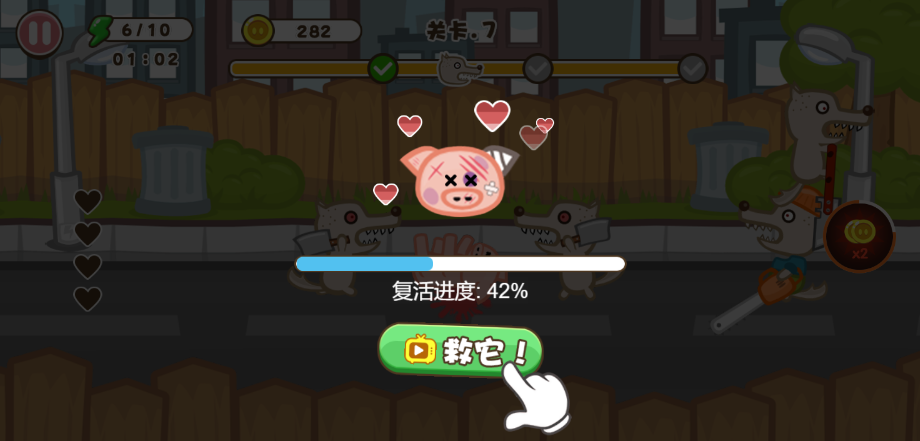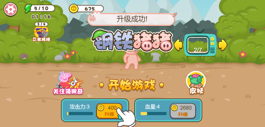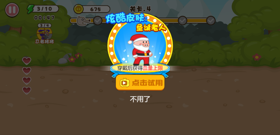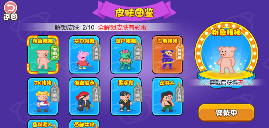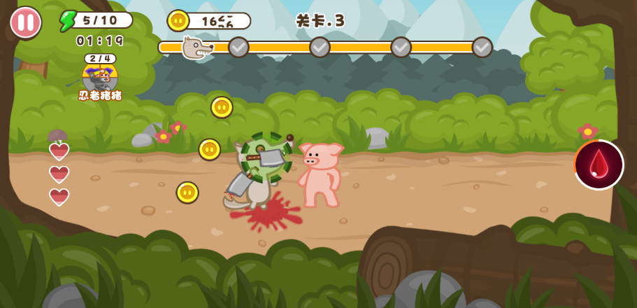 此游戏为动作闯关类游戏,一款横版2D动作闯关游戏,玩家通过控制一只拥有格斗技能的“钢铁猪”击败敌人,解锁不同皮肤和关卡。包含多种敌人类型和关卡设计,支持解锁武器提升战斗力。