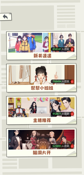 此游戏为休闲益智类游戏,这款游戏专注于测试玩家的眼力和反应速度。玩家需在限定时间内根据要求找出合理之处,游戏分为四大类:新关速递、帮帮小姐姐、主播推荐、脑洞大开,每个种类又有很多关卡,快来挑战吧!