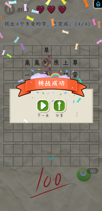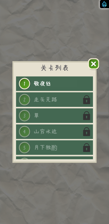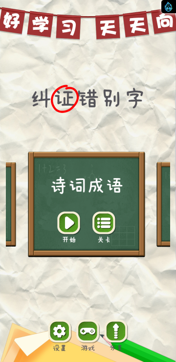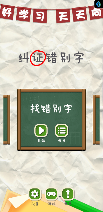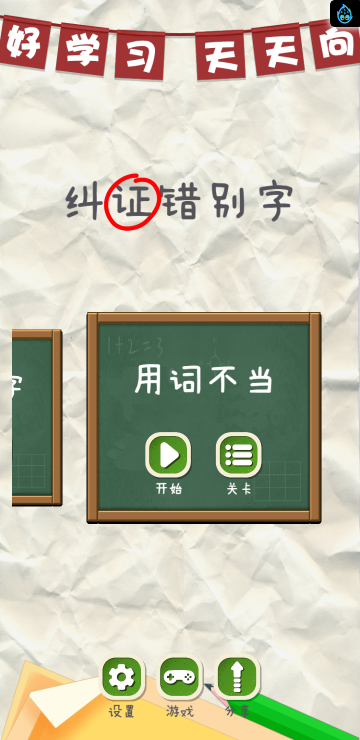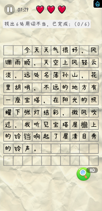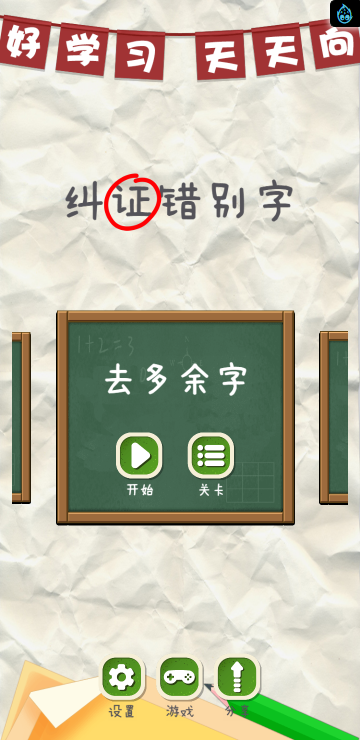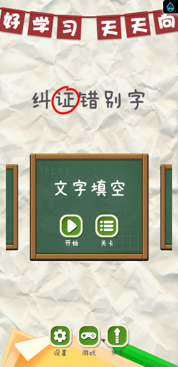 此游戏为文字类游戏,游戏分为几种游戏模式:找错别字、用词不当、文字填空、诗词成语、去多余字等模式,每个模式关卡数也不同,需要自己多多挑战哦!