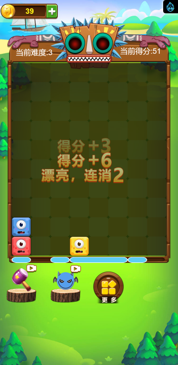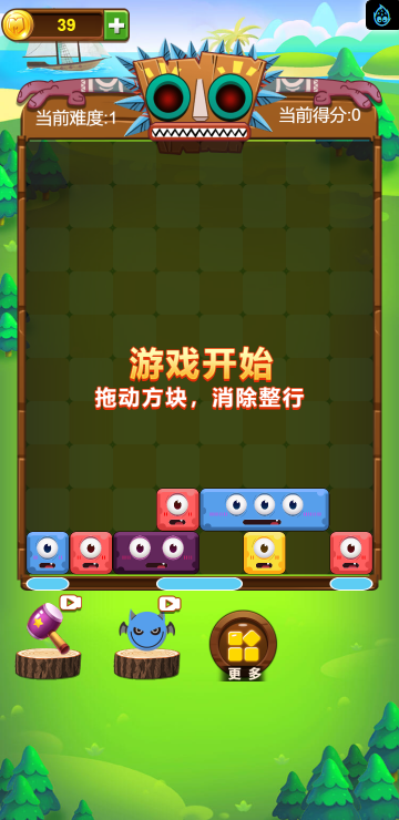 此游戏为休闲消除类游戏,游戏内容很简单,每移动一步方块就会从底部往上生一层,你的目标就是消除所有木块,只要一行全部填满就可以完成消除,当木块上升到触碰到顶部则游戏结束,适当的使用道具可以获得更高积分哦!