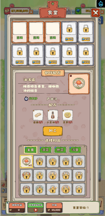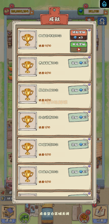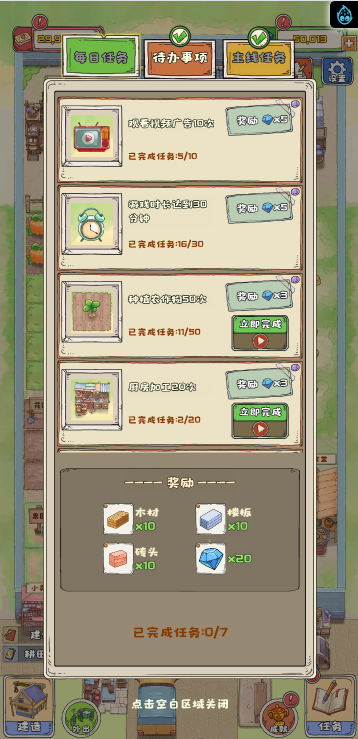 这是一款模拟经营类小游戏,游戏中你经营一个寨子,你可以通过各种方式赚钱,比如种地、加工、饲养、捕鱼、贸易等等,不同的方式需求建筑的等级也不一样,尽可能保证主房拥有更高等级,尽可能多的完成任务,快来试试吧!