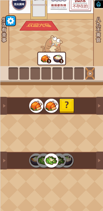 这是一款消除类小游戏,游戏中你将扮演餐厅服务员,为你的吗喽顾客提供不同的餐食,而每种餐食需要三个相同的食物才能合成,每一关都有一定数量的顾客,你需要全部满足他们的需求才算通关,快来试试吧!