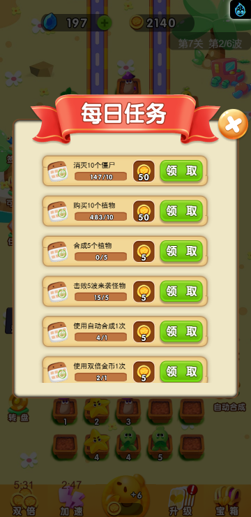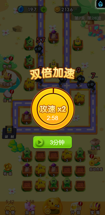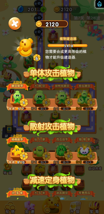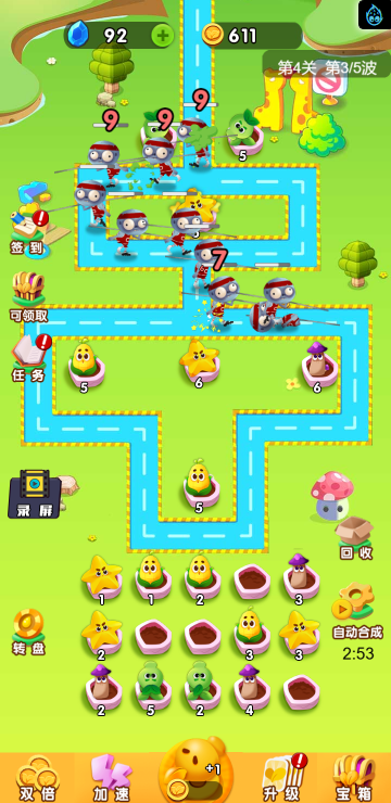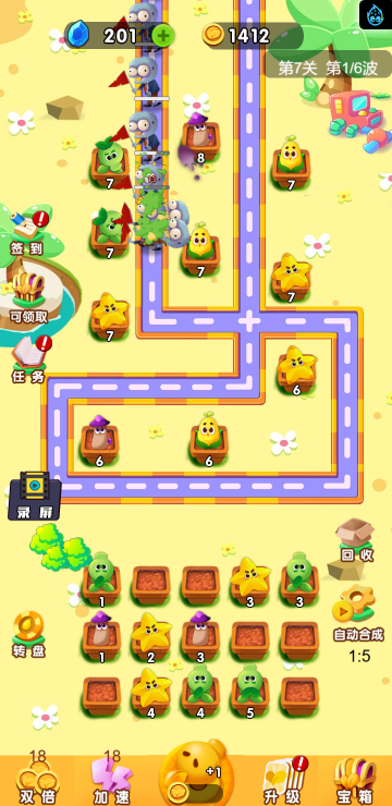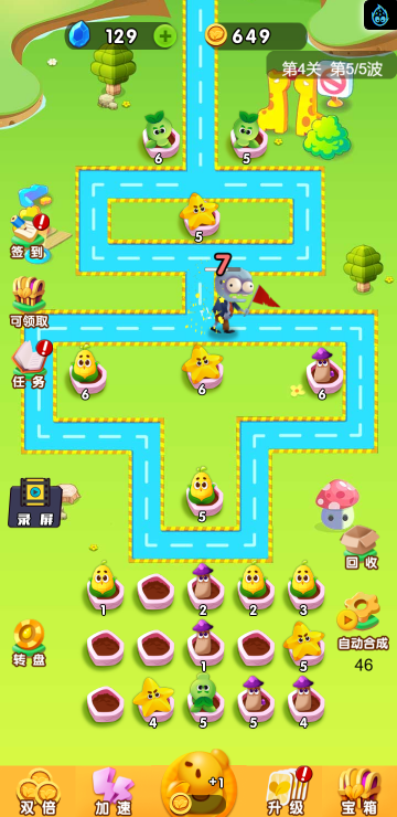 这是一款合成战斗类小游戏,游戏中你拥有多种花朵,通过合成的方式可以提升它们的战斗力,还可以通过升级来提升它们的属性,消灭每一波来犯的僵尸军团,不能漏掉一个哦,不然就要重新再来,特别要注意的是BOSS,只有不断升级才能顺利消灭它们,快来试试吧!