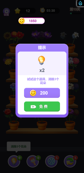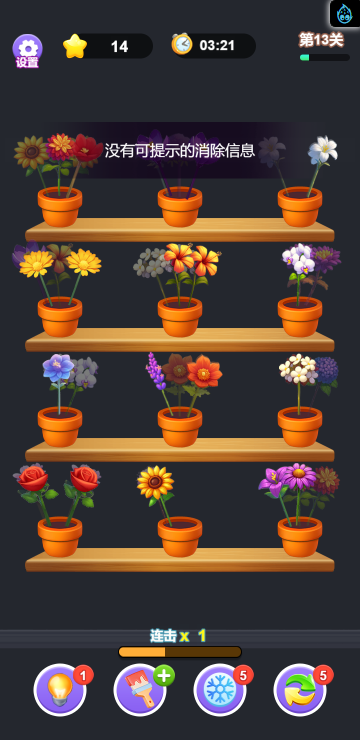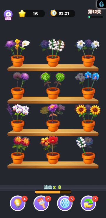 这是一款消除类小游戏,游戏中你变身为插花师,为不同种类的花进行分类,难度也随着关卡逐渐增加,你要合理安排花卉的位置,尽可能快的把隐藏在后面的花朵释放出来,不然越到后面越没有位置来放置它们了,快来试试吧!