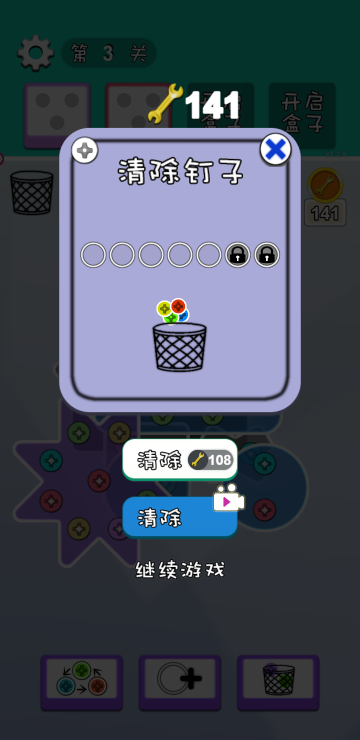 通过拆除不同颜色的钉子来解锁木板,当所有木板全部滑落即为游戏胜利,当备用螺丝孔全部装满则游戏失败,如果备用孔不够一定要记得多多利用道具哦。