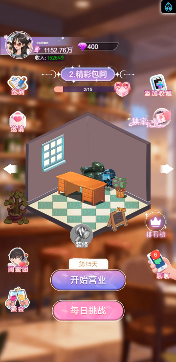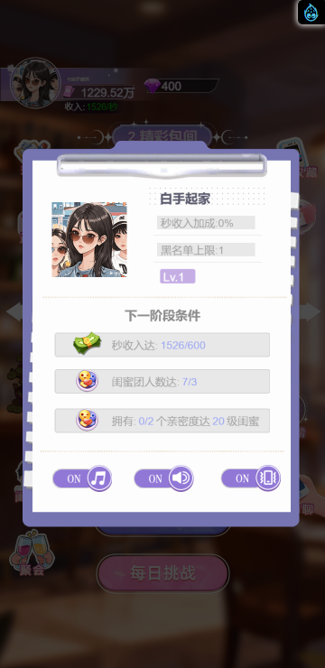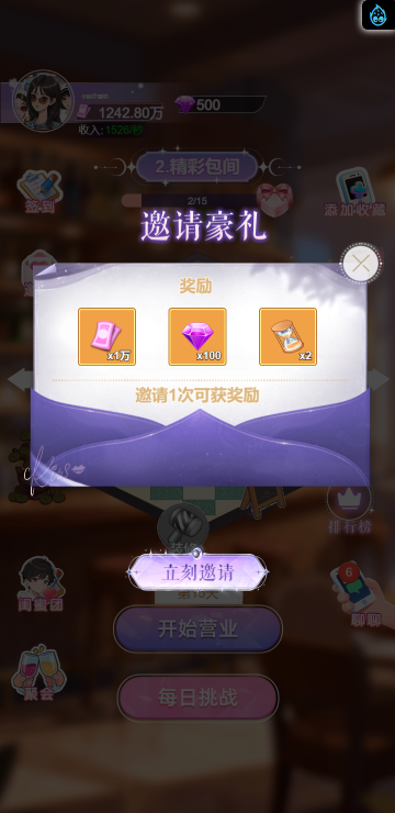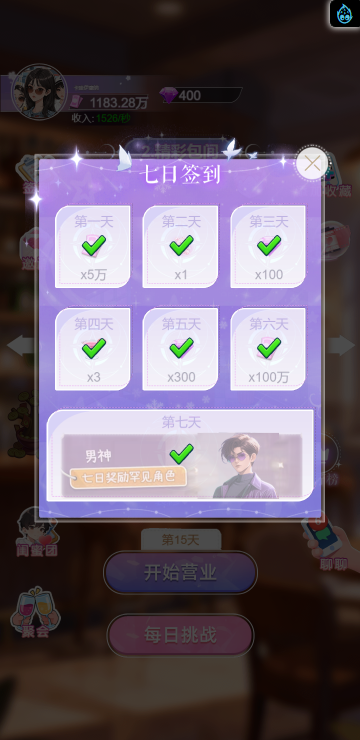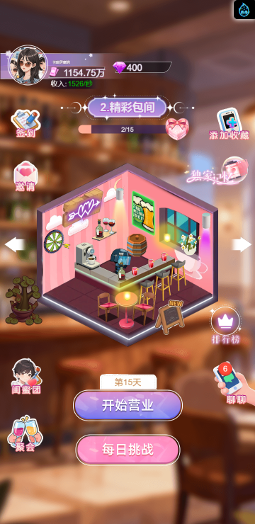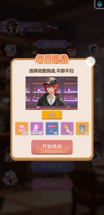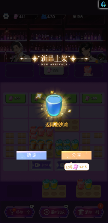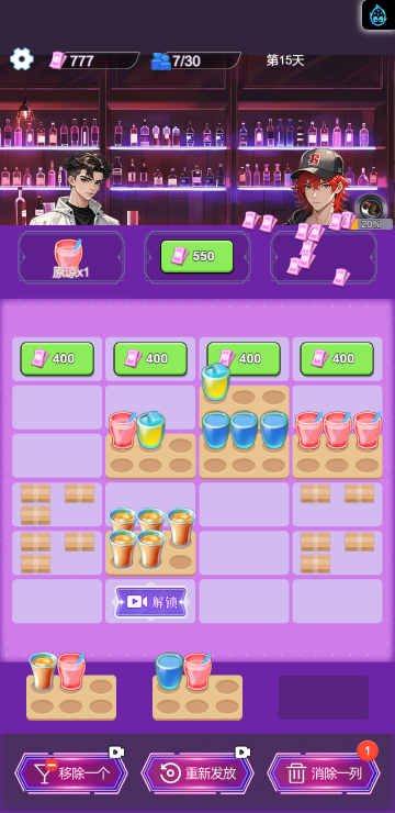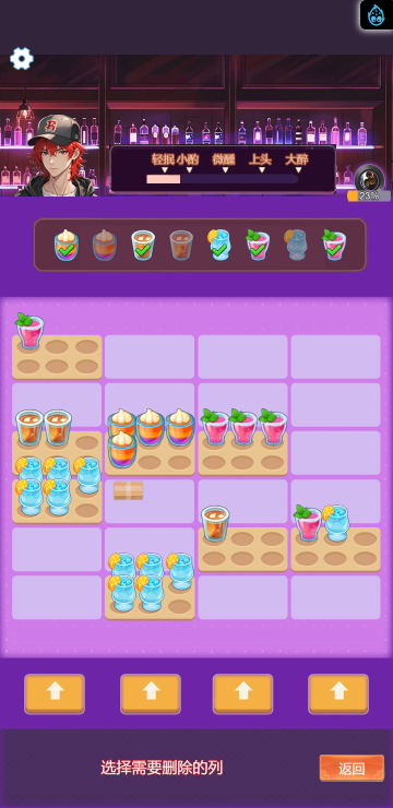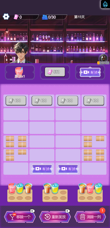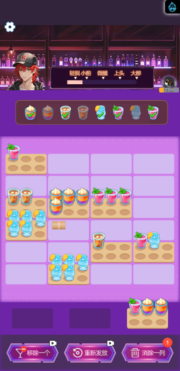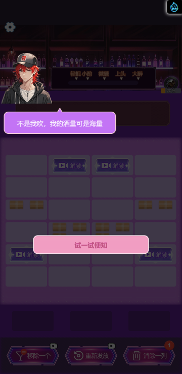 这是一款休闲消除类小游戏,游戏中你将扮演一名调酒师,满足所有顾客的需求,每一关都有不同的目标,达成目标即可解锁更多品类的酒,收集它们可以获得钻石奖励,用来购买道具装扮酒吧环境,与不同顾客聊天可以增加亲密度哦,快来试试吧!