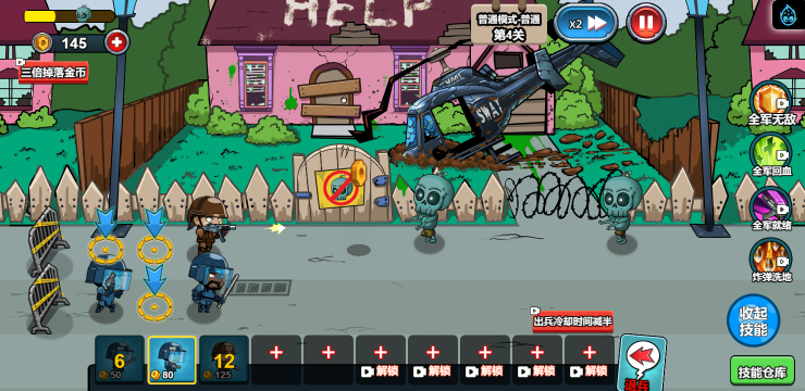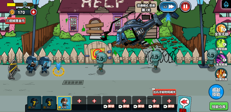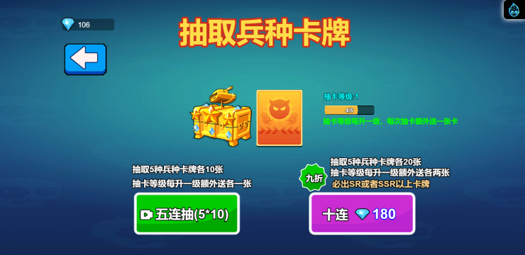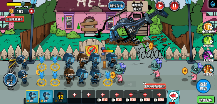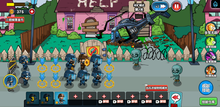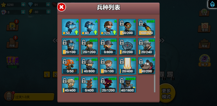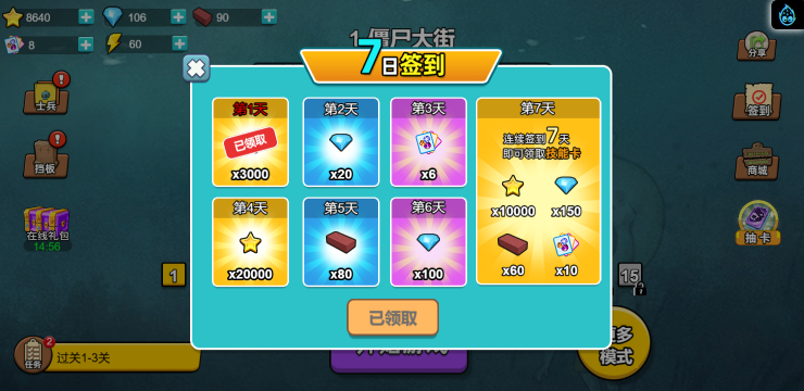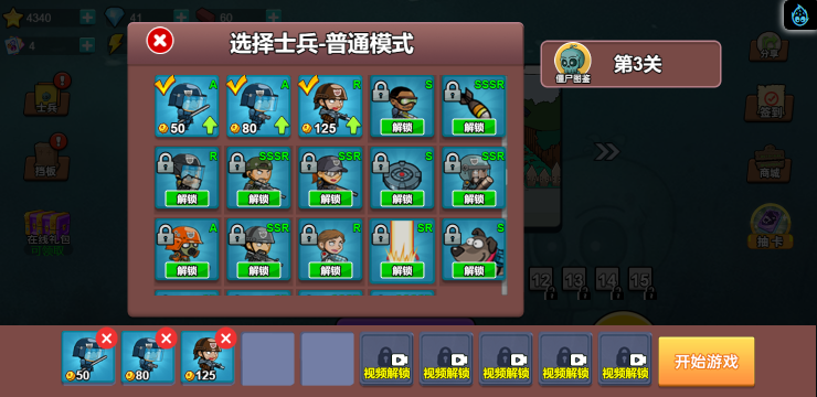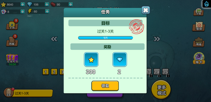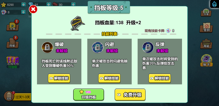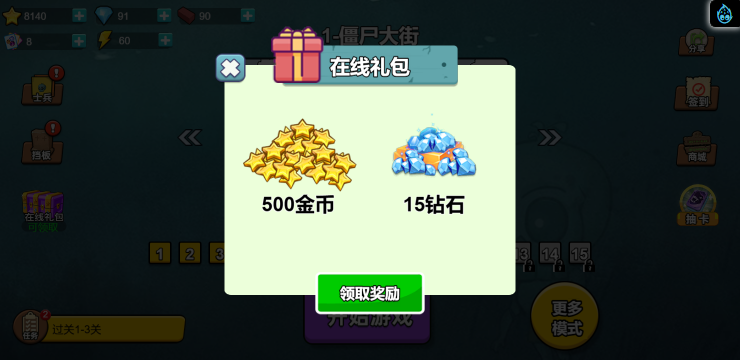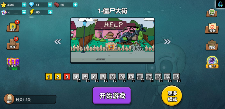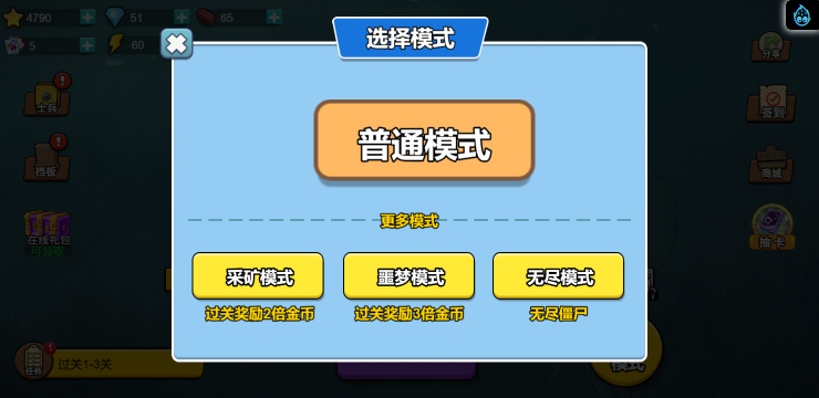 这是一款单机对战类小游戏,游戏分为多种模式:闯关模式、采矿模式、噩梦模式和无尽模式,玩法基本相同,闯关模式有小兵限制,其他没有,你需要建设合理的防线来对抗僵尸的攻击,如果小兵不够可以通过抽卡和碎片合成方式获得,升级来提升它们实力,快来试试吧!