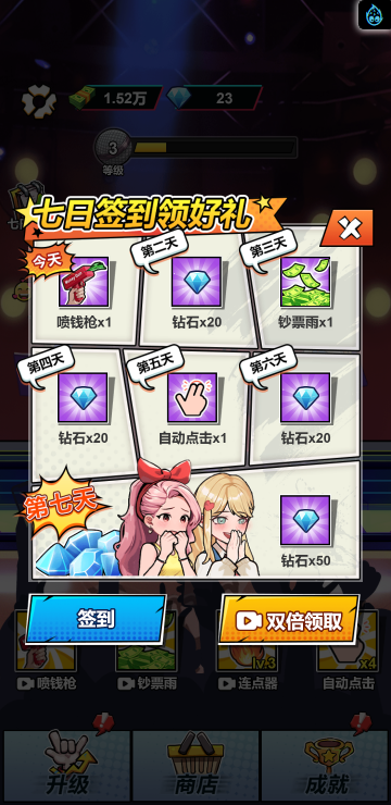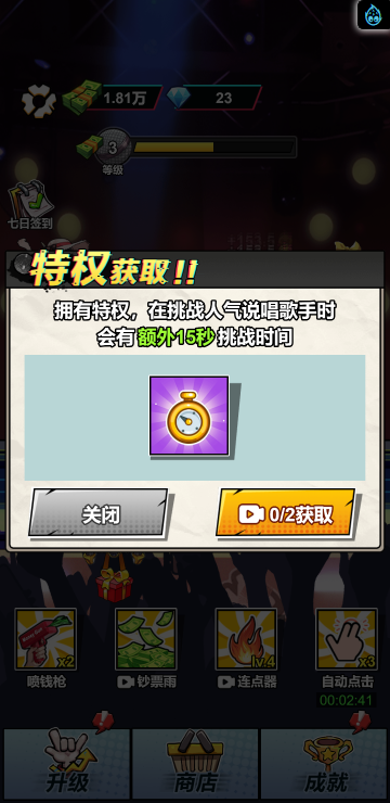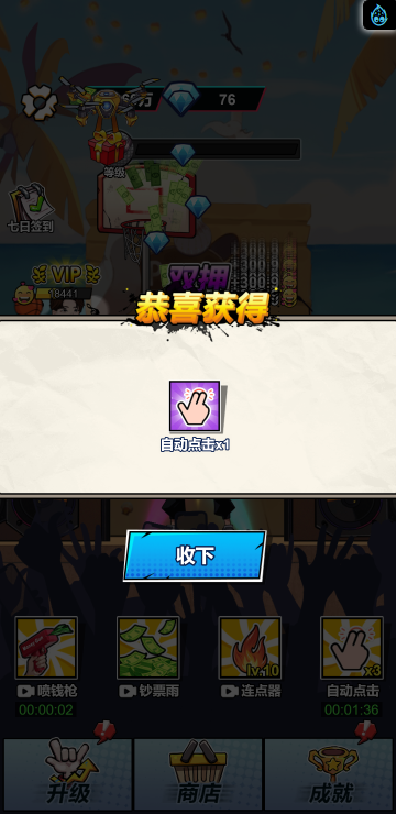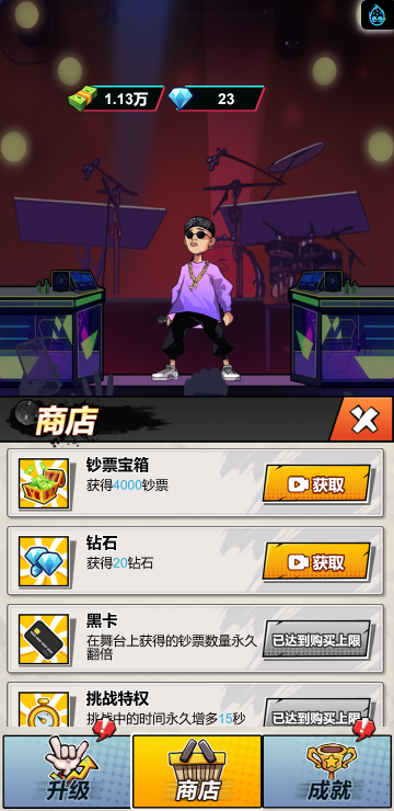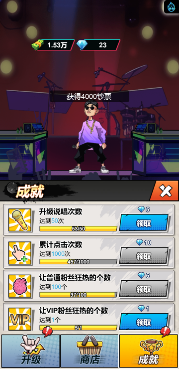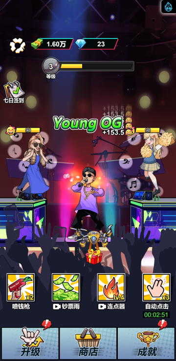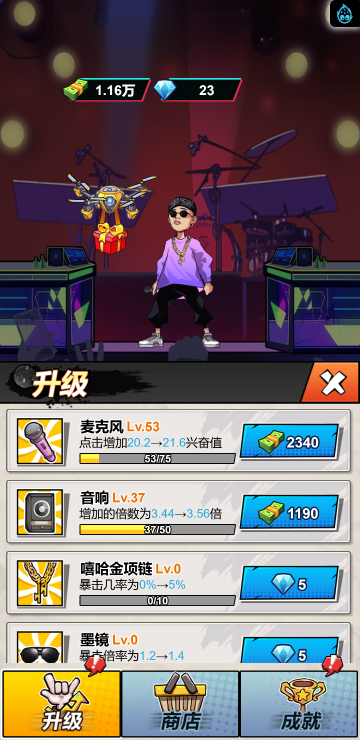这是一款养成类的游戏,作为主角的你需要通过不断赚钱来升级和解锁,还可以和你的乐队一起渲染气氛。