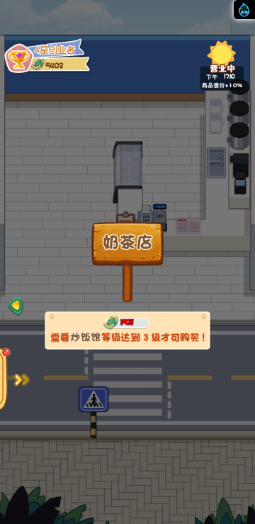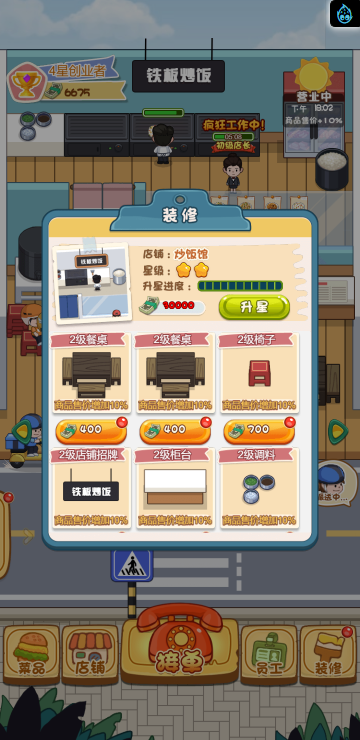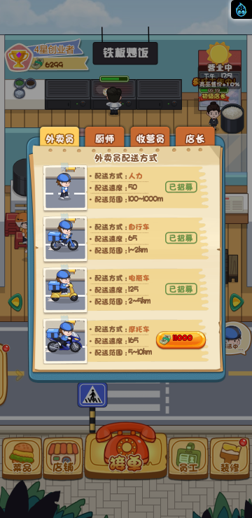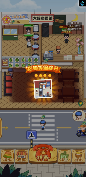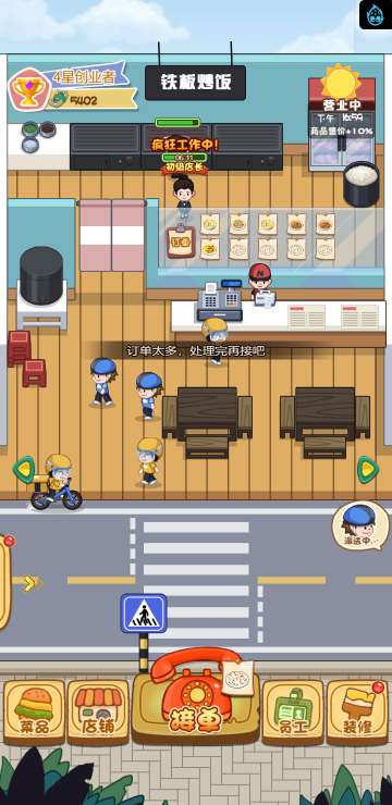 这是一款模拟经营的游戏,你经营多家餐饮店,根据骑手需求提供需要的餐品,达到一定程度可以解锁新的店铺。