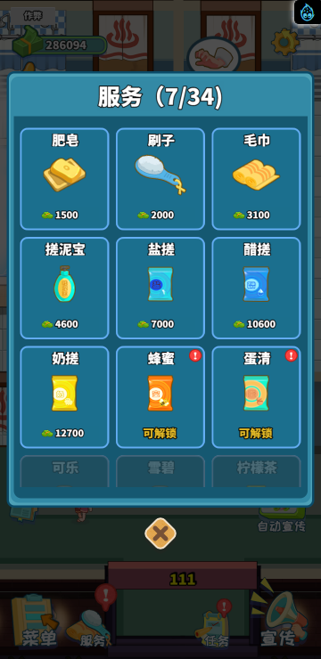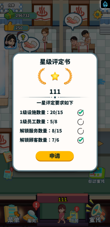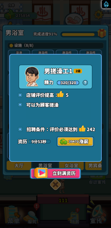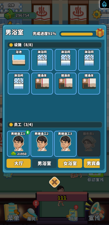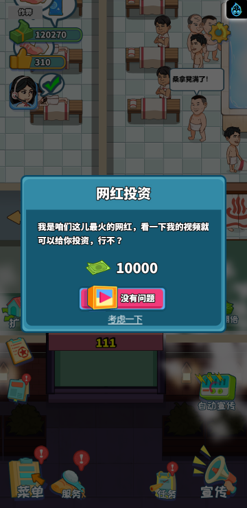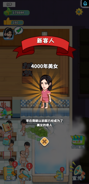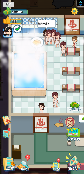 这是一款模拟经营类游戏,你经营着一家洗浴店,通过不断赚钱解锁更多区域和玩法。