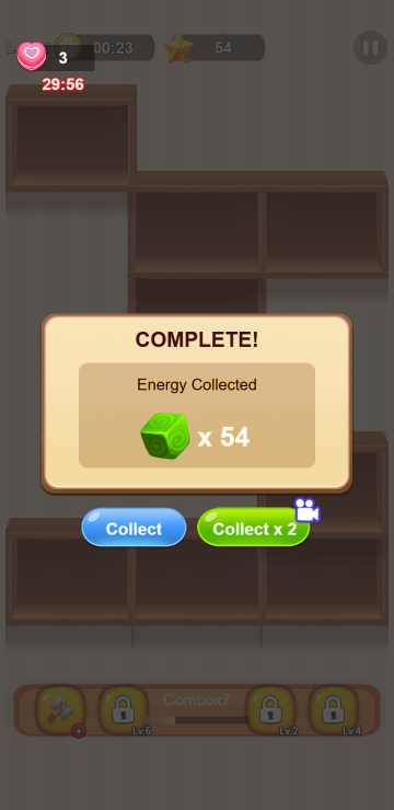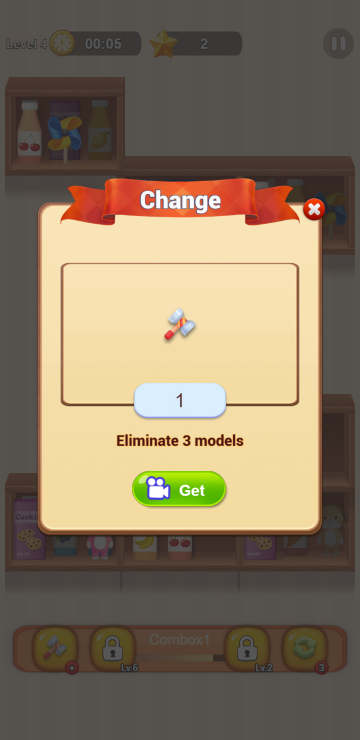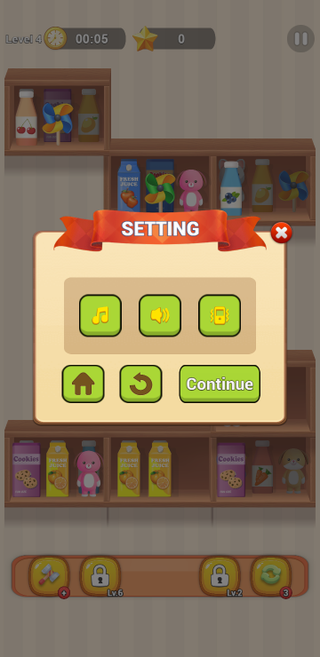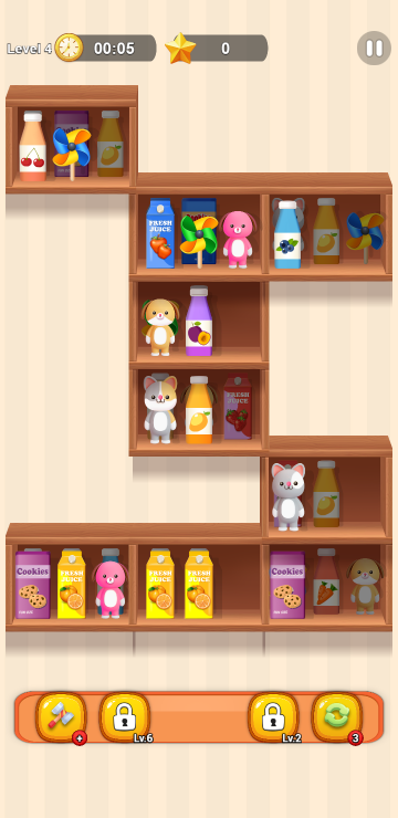 该游戏为英文版游戏,通过同类物品在同一个格子完成消除,当靠前的消除之后,后面的才能显示出来,把货柜上面所有物品全部消除即为通关,还可以使用各种道具哦。