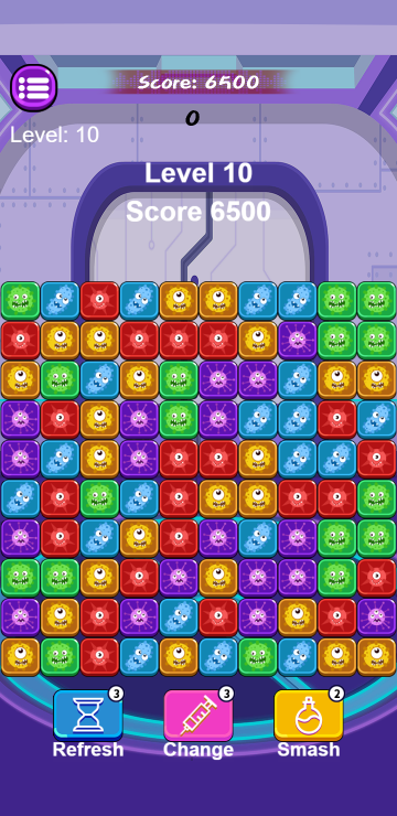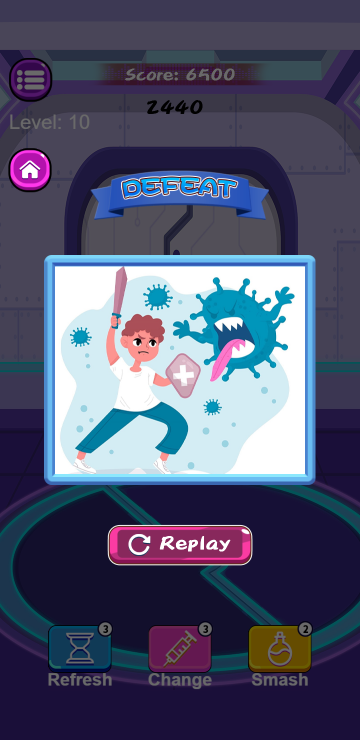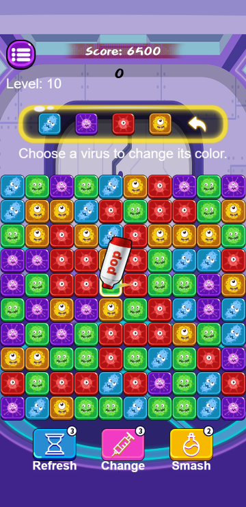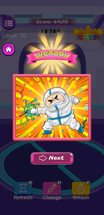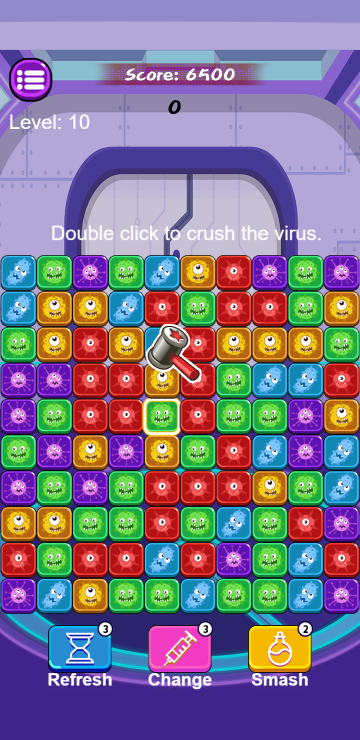 此为休闲消除游戏,游戏内有三种道具可以使用,同一个类型的病毒在一起2个及以上就可以消除,一次性消除个数越多分数加成越高,每一关达到指定分数即为过关,难度阶梯式递增。