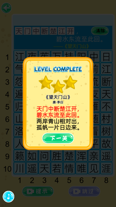 此游戏为休闲类游戏,简单来说就是根据古诗的上一句或者下一句来填出另外一句,完整且没有错误即可过关,不要被汉字看花了眼哦。
