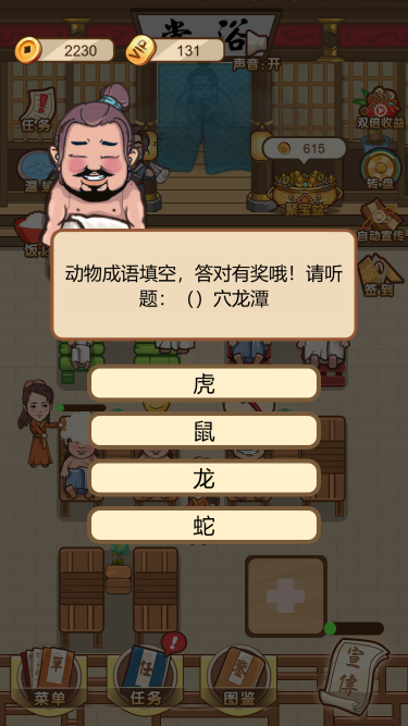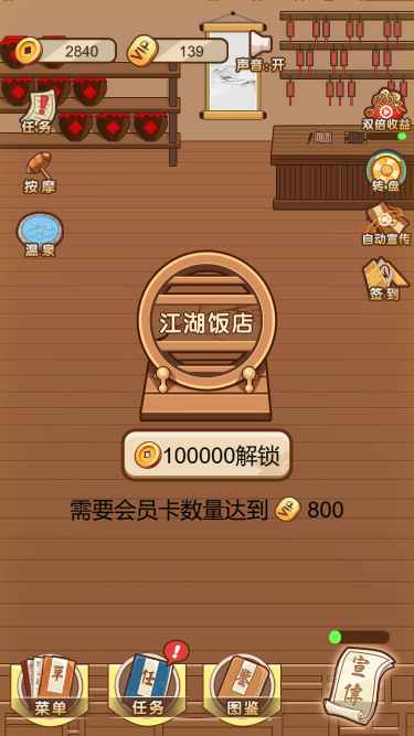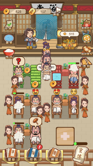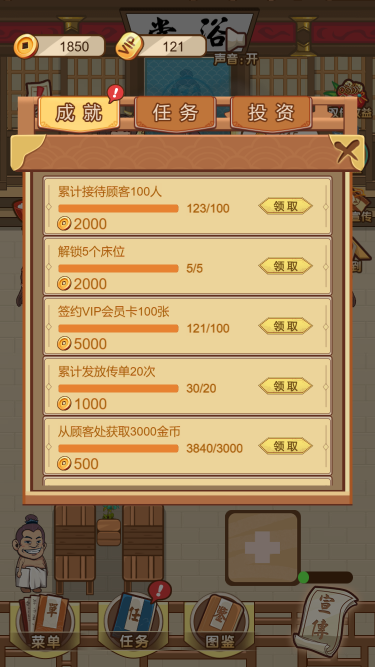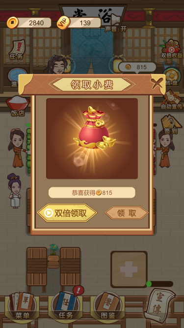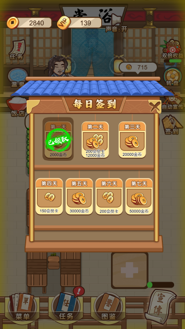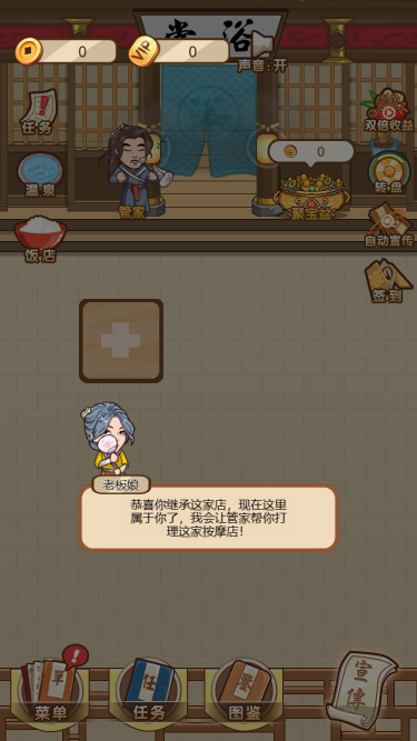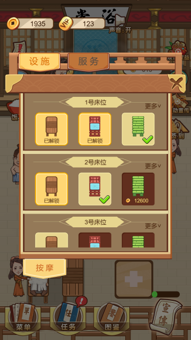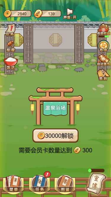 通过开店来赚取更多的钱,内容有洗浴店、温池店和饭店,当金币和VIP点数到达一点数目后才能解锁其他内容,可玩内容非常丰富,还有各种奖励相当丰厚。