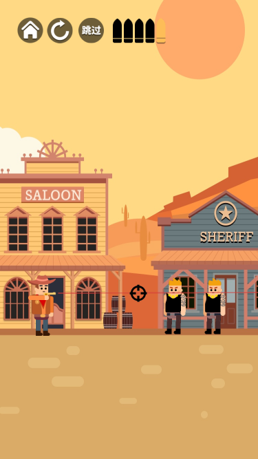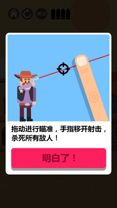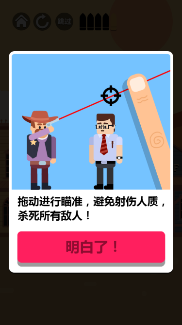此游戏为休闲枪战类游戏,通过拖动方向改变枪击的路径,在击败敌人的同时还要保证人质的安全,要注意子弹可以反弹的哦。