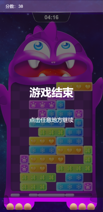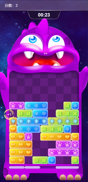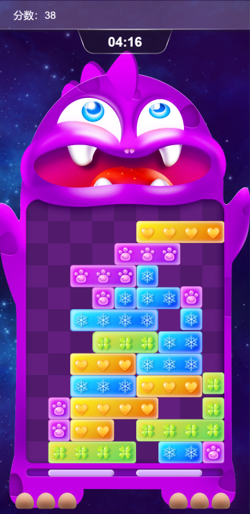 此游戏为休闲类游戏,你需要移动木块让每行填满即可消除,每移动一次,下方会随机升起一行不规则的木块,当最上端木块抵达小龙嘴巴即为游戏失败。