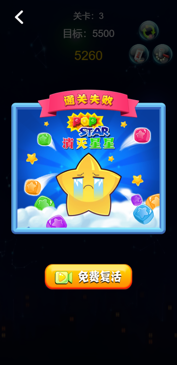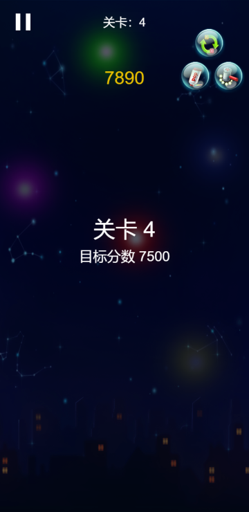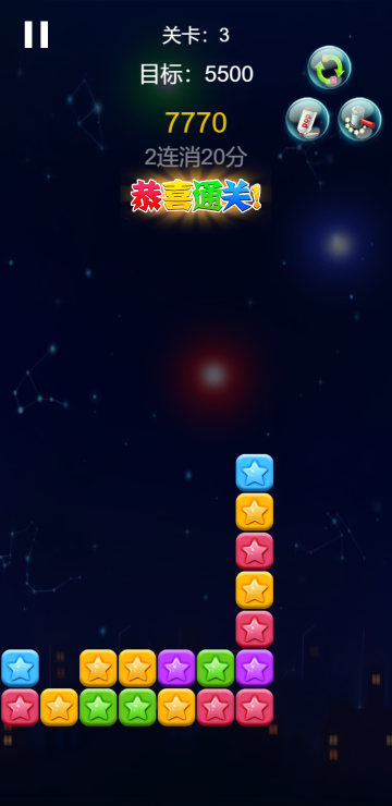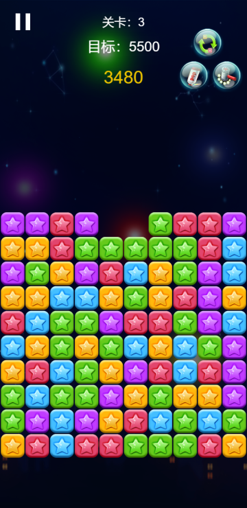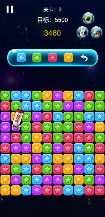 此游戏为休闲类游戏,通过消除同种颜色的星星来提升分数,当分数达到通关分数才算胜利,越往后分数越高,就越难达到,合理使用道具可以提升通关率。