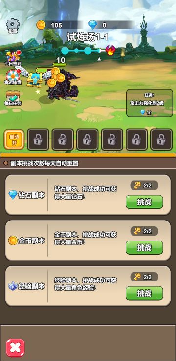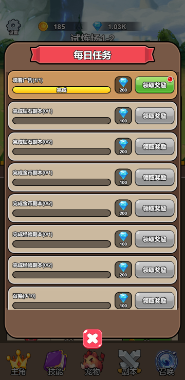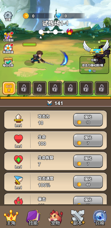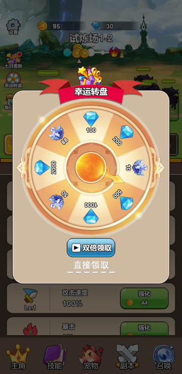 游戏内你可以设置打怪自动模式来刷取金币,金币可以用来强化属性,还可以通过转盘抽奖、每日签到、战斗宝箱和任务奖励等获取大量钻石,可用于召唤宠物或技能,培养宠物、学习技能可以提升自身实力,个人也有多款皮肤可供选择,玩法很丰富的。
