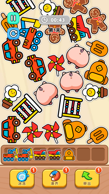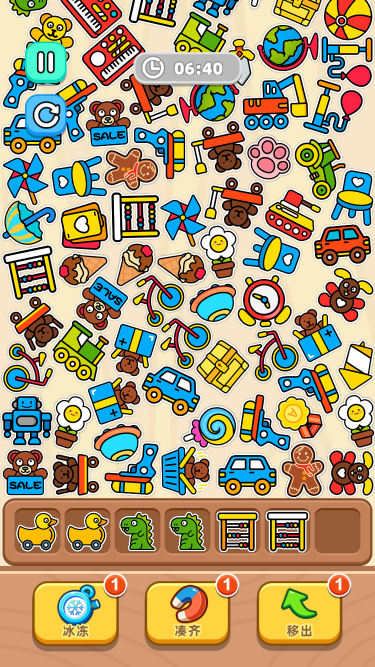 此游戏为休闲类游戏,游戏分为关卡模式和无尽模式,难度随之提升,三个一样的物品进入物品栏即可消除,当所有物品全部消除完成才通关。