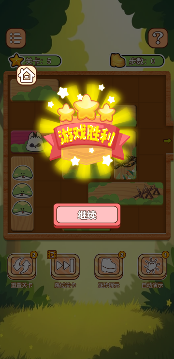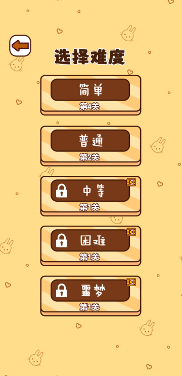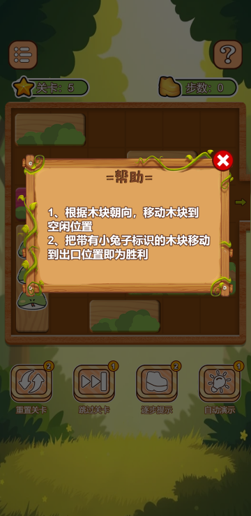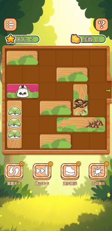 游戏共有5种模式,难度从简单到非常难,每种模式也有1150关卡,游戏内容很简单,将带有小兔子的滑块滑到出口即为游戏胜利。