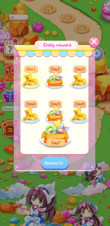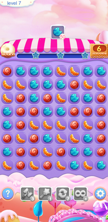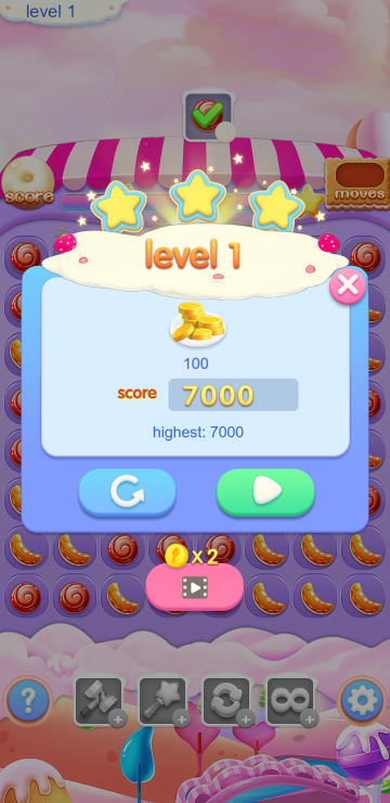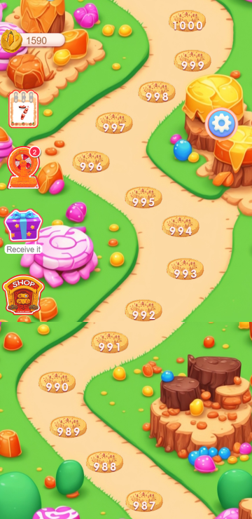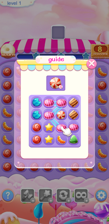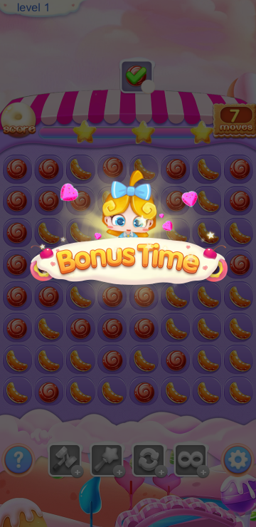 此游戏为休闲消除类游戏,游戏语言为英文版,关卡共有1000关,每一关都有目标,当把目标糖果消除完成才算过关,合理使用道具可以让游戏更加轻松哦。