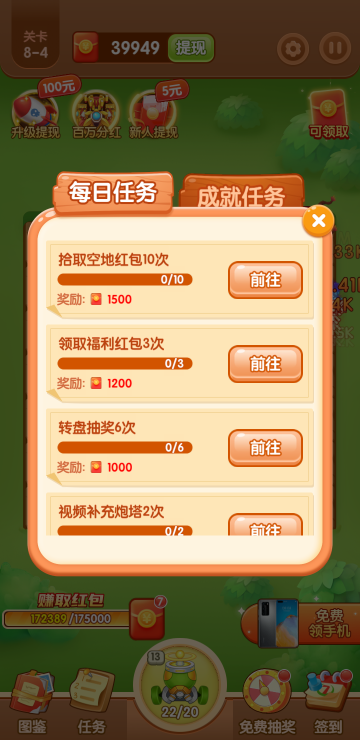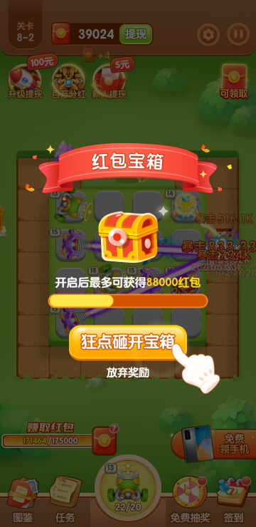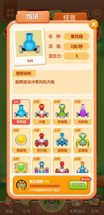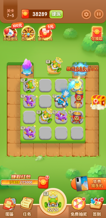 此游戏为塔防战斗类游戏,游戏主要特色为可以通过各种途径获得红包,比如合成炮塔、开红包奖励、开箱子奖励等等,达到一定金额可提现,更可以通过抽奖活动获得手机碎片赢取实物大奖,一边玩游戏一边还能拿红包,还不快来体验一下!
