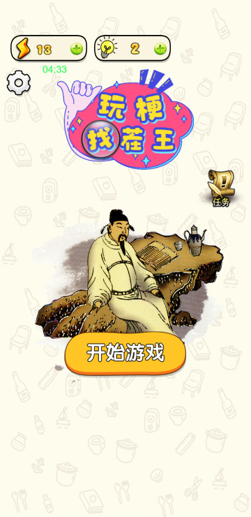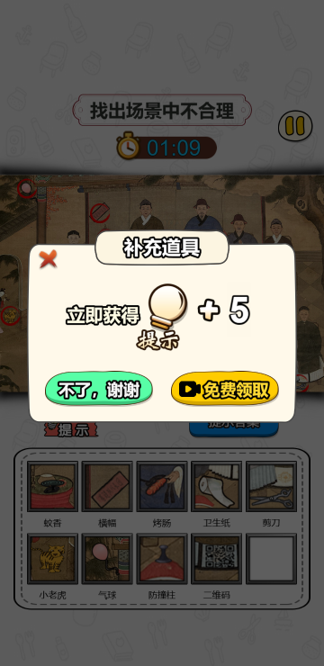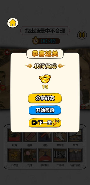 此游戏为休闲益智类游戏,在每一关,给出的整个画面中会有很多不合理的地方,你需要在规定时间内全部找出它们并标记出来,这是一个很考验眼力的游戏,快来挑战一下吧。